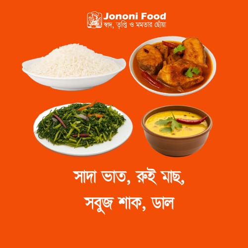 সাদা ভাত, রুই মাছ, সবুজ শাক ও ডাল হলো একেবারে খাঁটি বাঙালি খাবারের পরিচয়, যা একদিকে পুষ্টিকর, অন্যদিকে স্বাদের দিক থেকেও অতুলনীয়। ধোঁয়া ওঠা গরম ভাতের সাথে রুই মাছের ঝোল মিশে তৈরি হয় অপূর্ব এক স্বাদ। এর সাথে তাজা সবুজ শাক দেহে ভিটামিন ও খনিজ যোগায়, আর ডাল যোগ করে প্রোটিন ও তৃপ্তি।