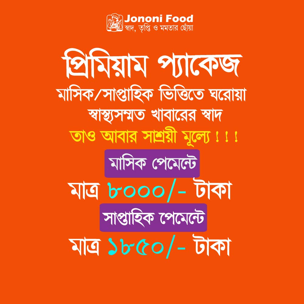 প্রিমিয়াম প্যাকেজে ব্যবহার করা হয়েছে উচ্চ মানের উপাদান, সুস্বাদু ও পুষ্টিকর খাবারের সমন্বয়। প্রতিটি পদ তাজা রান্না করা, স্বাস্থ্যকর ও আরামদায়ক পরিবেশে তৈরি। এটি দৈনন্দিন খাবারের জন্য এক অনন্য অভিজ্ঞতা প্রদান করে।