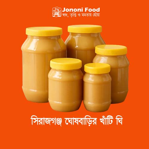 সিরাজগঞ্জের ঐতিহ্যবাহী ঘোষ বাড়ি থেকে সংগ্রহ করা খাঁটি গাওয়া ঘি এখন জননী ফুড-এ। শতভাগ বিশুদ্ধ গরুর দুধ দিয়ে তৈরি এই ঘি-তে নেই কোনো কৃত্রিম রং, সংরক্ষণকারী বা কেমিক্যাল। ঘরের পরিবেশে ঐতিহ্যবাহী প্রক্রিয়ায় প্রস্তুত করা হয়, যাতে ঘ্রাণ, স্বাদ এবং পুষ্টিগুণ অক্ষুণ্ণ থাকে।