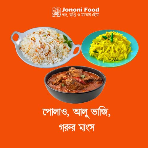 পোলাও, আলু ভাজি ও গরুর মাংস একত্রে তৈরি করে সুগন্ধি, সমৃদ্ধ এবং প্রাকৃতিক স্বাদ।